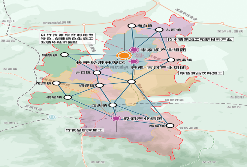 以竹资源综合利用为特色,创建绿色生态工业循环经济园区,以长宁经济开发区为载体,加快双河竹食品加工产业组团、宋家坝竹木制品精深加工和新材料产业组团、开佛-古河绿色食品饮料加工组团建设,加快经济开发区规划修编、承载能力建设,改变经济开发区规模化、集约化水平低的现状,解决经济开发区产业集聚功能和交通物流功能相互制约。通过不断优化园区功能布局和空间布局,提升工业经济发展质量和效益,力促现代工业体系更加完善,为参与“双城一区”产业分工、承接“双城一区”产业转移打下坚实基础,切实构建“一载体、三组团”的工业发展空间布局。
