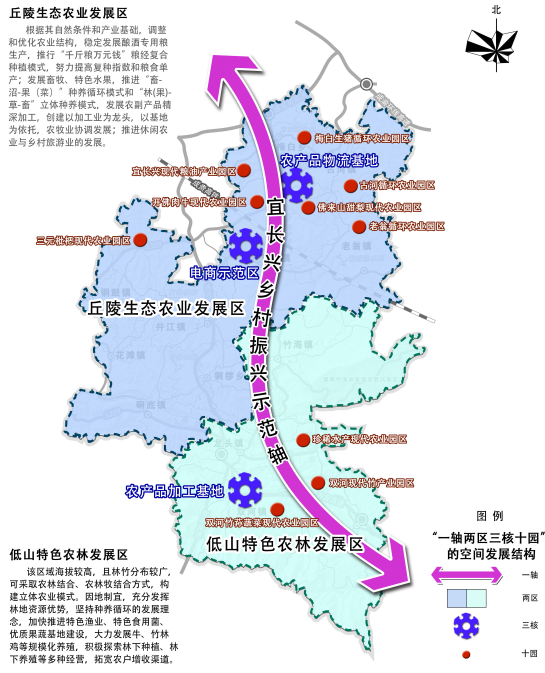 7一轴两区三核十园:一轴指宜长兴乡村振兴示范轴;两区是指丘陵生态农业发展区、低山特色农林发展区;三核指以长宁镇和双河镇加工产业园为核心,打造川南重要农产品加工基地,以农产品冷链物流中心为核心,打造川南重要农产品物流基地,以长宁温州商贸城农业电商产业园为核心,打造川南重要电商示范区;十园指竹子现代农业园区、开佛肉牛现代农业园区、粮油现代农业园区、长江上游珍稀鱼类种业园区、正邦生猪循环农业园区、三元枇杷现代农业园区、双河果蔬现代农业园区、铜鼓生猪种养循环农业园区、古河种养循环农业园区、桃坪稻渔现代农业园区。