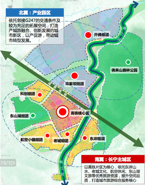 9景城一体文旅发展极指蜀南竹海、长宁县城、世界竹景观大道,淯江文旅走廊、龙头氡温泉。北部生态文旅区指蜀南花海、七洞沟、佛来山、碧浪湖。南部竹石文旅区指梅硐竹石林、长征国家文化公园(长宁县)、双河文化创意型小城镇。西部田园文旅区指龙蟠溪、苦竹天泉。