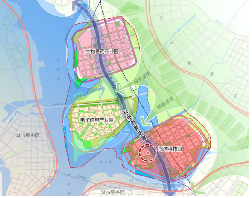 省域副中心城市核心城区。以海东新区起步区为核心,以海湾大桥、湛江内港湾为未来城市格局的横轴、纵轴,重点打造桥东片区、奥体片区、湛一中片区、高铁片区,形成“一核、两轴、多组团”的城市空间布局。加强TOD交通基础设施建设,提升以“学位”为代表的教育水平,完善以“床位”为代表的医疗服务配套建设,为湛江钢铁、中科炼化、巴斯夫等投资超百亿美元世界级产业基地提供高品质生活配套设施,为创造国内领先的高技术园区提供优越条件。发挥海东新区国际合作重要门户、国家海洋战略重大平台、大西南出海主通道服务基地作用,打造成为粤西中心城市新兴载体、南亚热带生态海湾新城。