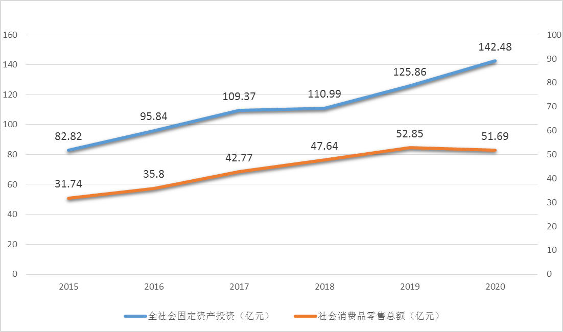 图3 筠连县十三五时期固定资产投资与社会消费品零售总额情况(亿元)