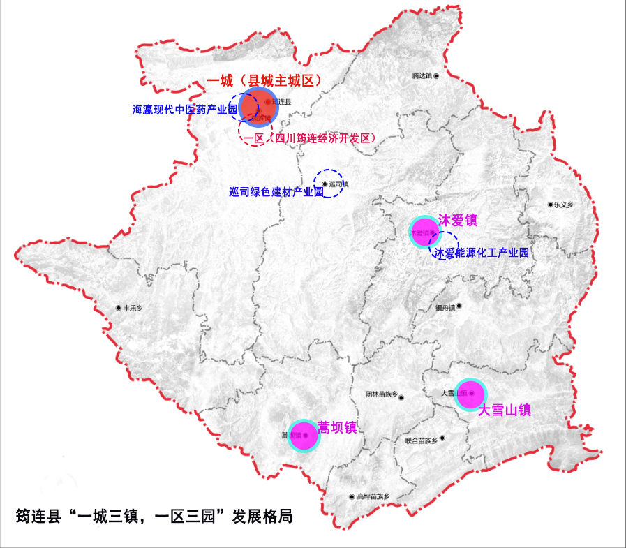 三镇(沐爱镇、蒿坝镇、大雪山镇):以“三镇”为县域副中心,构建县域经济、公共服务和乡村振兴支点。突出发展肉牛、茶叶和旅游产业,有序推进巡司镇、沐爱镇2个中心镇和12个场镇进行升级改造和建设。