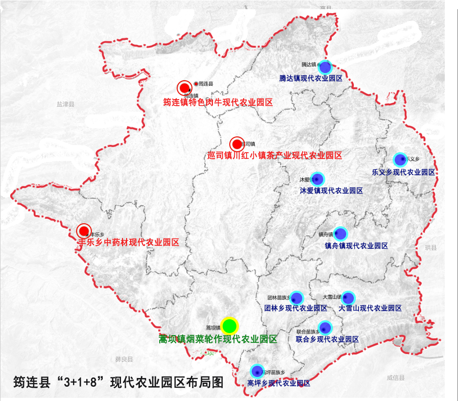 15.“3+1+8”现代农业园区:“3”是指巡司镇川红小镇茶产业现代农业园区、筠连镇特色肉牛现代农业园区、丰乐乡中药材现代农业园区,“1”是指与市烟草公司共建蒿坝镇烟菜轮作现代农业园区,“8”是指全县其他8个乡镇的现代农业园区。