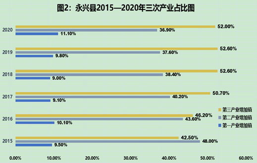 3.产业发展步入快车道。“十三五”期间,产业结构更趋合理,质量不断优化。三次产业结构由2015年的9.5:48.0:42.5,优化调整到2020年的11.1:36.9:52.0,第三产业增加值占比超过了50%。工业经济提质。坚定不移实施“中国银都”首选发展战略,争取到国家“城市矿产”示范基地项目建设用地指标单列政策,基本形成了以稀贵金属综合回收利用产业为主导,电子信息、新材料、装备制造、节能环保产业为协同的“1+4”新体系,稀贵金属综合回收利用产业产值达800亿元,永兴经开区正在向千亿园区迈进,雄风、众德等十多家稀贵金属综合回收利用企业进入湖南省有色金属50强,“联合国银”银饰等数十个产品认定为湖南名牌产品。第三产业提速。积极创建国家全域旅游示范县,突出发展生态文化旅游产业,湖南长鹿国际旅游休闲度假区等项目进展顺利,永兴丹霞森林公园成功晋级为国家级森林公园,形成的以“碧水丹霞、橙缘银都”为主题的文旅产业取得蓬勃发展。乡镇电商公共服务(物流)站实现全覆盖,全县网店达3800余家,微店上万家,网上销售额近10亿元,永兴冰糖橙、银制品线上销售比重达30%,被评为“全国电子商务进农村优秀示范县”。现代农业稳步发展。深化农业供给侧结构性改革,农业产业化进程加快,形成了以优质米、冰糖橙、油茶、烤烟等为主的产业体系。荣获全省粮食生产标兵县、全省茶油大县、全省首批林下经济发展重点县、全省烟叶工作先进县。永兴冰糖橙认定为中国驰名商标和国家地理标志保护产品,荣获全国名特优新农产品、中国中部(湖南)农业博览会产品金奖、全国十佳柑橘地标品牌”和“湖南十大农业区域公用品牌”等殊荣。第四届全国果业品牌大会暨第二届中国(长沙)优质农产品博览会金奖。全县新型农业经营主体蓬勃发展,沃原生态庄园被评为国家五星级休闲农庄,前进农庄被评定为湖南省五星级休闲农庄,松柏村列为全省休闲农业集聚发展示范村后备村,一二三产业融合步伐加快。