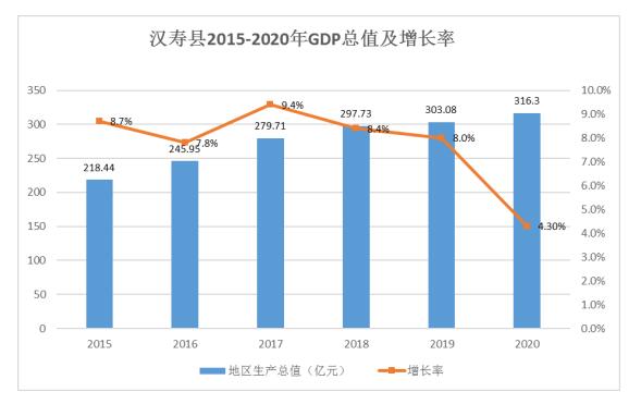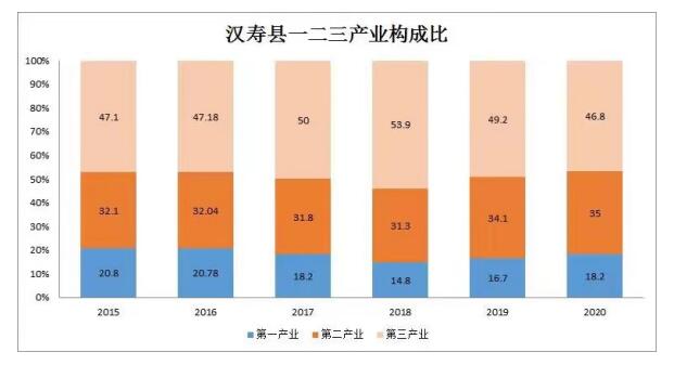 农业与二三产业融合发展,制造业与现代服务业双轮驱动,产业结构调整取得显著进展,三次产业结构进一步优化,由2015年的20.8:32.1:47.1调整为2020年的18.2:35:46.8,二、三产业比重逐步提高。一是现代农业蓬勃发展。主要农产品稳量提质。稳定耕地保有量6.5万公顷,粮食播种面积165万亩、总产59.3万吨,建成120万亩高中档优质稻基地;稳定蔬菜播种面积42万亩、总产120万吨,围堤湖蔬菜产业园成功创建省级标准化示范区;油茶、特色水产品、生猪、家禽等农产品产量均实现稳步增长。经营主体不断壮大。流转土地48.67万亩,现有种养大户3500多户、农民专业合作社701家、家庭农场401家、星级休闲农庄7家、农村电商企业126家,省级农业产业化龙头企业华乐食品连续5年荣登常德市出口创汇企业榜首,并成功申报国家级龙头企业。农村产业融合发展取得新突破,成功申报国家农村产业融合发展示范区。品牌效应不断显现。农产品标准化覆盖率达到70%以上,87个农产品获“三品一标”认证,“餐餐见”、“仙湖”等10个产品被认定为湖南省著名商标,“汉寿甲鱼”入选湖南省“十大特色农产品品牌”,连续5年举办汉寿蔬菜文化节,汉寿蔬菜、汉寿甲鱼、华乐烤乳猪等品牌影响力不断提升。二是新型工业快速发展。工业总量增长明显。2020年,全县规模工业完成总产值297亿元,为“十二五”末期的1.5倍,规模工业增加值占工业增加值比重达75.5%,规模企业达到149家,完成工业固定资产投资149亿元。质量效益显著提升。2020年,全县规模工业完成主营业务收入286亿元,是“十二五”末期的1.7倍;完成利税总额25亿元,其中利润22.7亿元,分别是“十二五”末期的1.7倍、1.8倍。“两化融合”得到更广泛的重视,一批重点骨干企业的信息化水平得到提升。淘汰落后产能与节能降耗工作取得实效,全县关停苎麻脱胶企业4家,粘土砖厂57家,纸厂1家。主导特色产业来势较好,“重点支撑、多点推进”的产业发展格局基本显现,形成了装备制造、医药化工为主,农产品加工、电子信息为辅,新材料、新能源为重要补充的现代产业体系。三是现代服务业稳健发展。旅游产业发展成效明显。积极开展国家全域旅游示范县申报工作,扎实推进环洞庭湖精品旅游线路重点县建设,已初步形成清水湖野生动物园,蔬菜公园、青山湖候鸟公园为重点的“三园一线”的精品旅游线路。随着清水湖五星级酒店、清水湖野生动物园等项目陆续推进,2020年共接待国内外游客410万人次,实现旅游综合收入37.5亿元。商贸流通繁荣活跃。大力推进全国电子商务进农村综合示范县创建,建立272家电子商务公共服务站点,乡村覆盖率达到100%。外贸主体培育初具成效。进出口和外资企业由35家发展到53家,累计出口创汇57081万美元,年递增率为19%。连续十二年获得全市“出口创汇先进单位”、“加工贸易先进单位”,连续五年获得省商务厅授予的“湖南省出口基地县”、“外贸强县”、“湖南省农产品出口基地县”、“湖南省外贸工作先进单位”等称号。此外,冷链物流、健康养老、文化创意等新兴服务业保持快速发展态势。