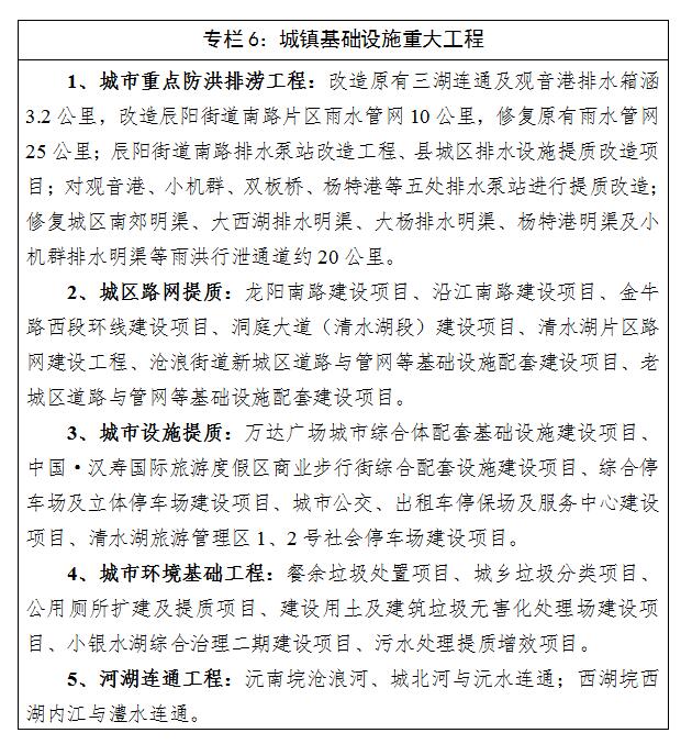 城乡面貌明显改善,城镇化率达49.1%。坚持建管并举,推动县城“南移西拓,扩容提质”,荆楚路、环湖路、滨湖路等一批市政路网相继建成;完成县城区供水管网改造及供水调度中心建设,保证县城区供水水质;采用截污纳管、清淤疏浚、生态修复等措施,消除县城区龙珠渔场、小银水湖等多处黑臭水体,改善城区水环境质量;完成县城污水处理厂二期扩建及提质改造、汉寿大道污水管网建设,新增污泥处理中心;启动蒋家嘴、罐头嘴等19个乡镇(街道)污水处理厂建设,实现乡镇污水处理设施全覆盖;实施城建项目73个,完成棚户区改造2万余户、农村危房改造13954户,恒大、碧桂园等世界500强企业入驻汉寿。强力推进城区秩序综合整治,打造城市“最美客厅”,市容市貌焕然一新。完成多条小街小巷改造,以及屈原广场、芙蓉广场、三联广场等区域林荫停车场升级改造等工程;开展蒋家嘴美丽城镇、朱家铺省级特色镇、罐头嘴和太子庙重点中心镇以及其他乡镇的基础设施建设工作。交通基础设施大力改善。累计完成交通固定资产投资约35亿元,比“十二五”增加15亿元,全县公路总里程达到2320公里,比“十二五”新增700余公里。共完成国省干线改造80公里,新建农村通畅公路326公里,拉通断头路300公里,完成危桥改造76座,渡改桥6座,实施农村公路安保工程800公里,实现了乡镇通畅与行政村通达“双百”目标。